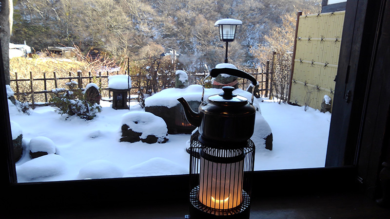 いよいよ那須温泉も冬の季節の到来! みちのくの中庭も雪景色。 あったか〜い甘酒やすいとんで、身も心もポッカポッカに!!